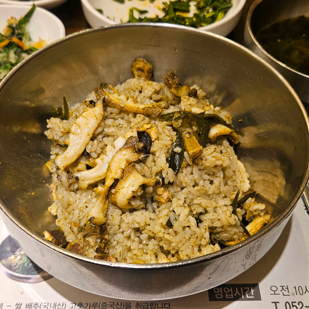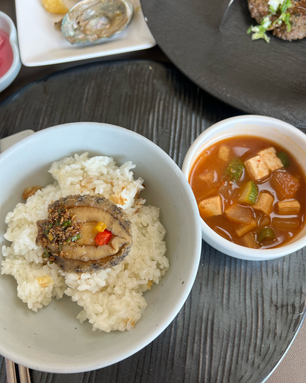 전복밥은 쫄깃한 전복이 넉넉하게 올라가 있어 식감도 좋고 고소한 맛이 살아 있어요.